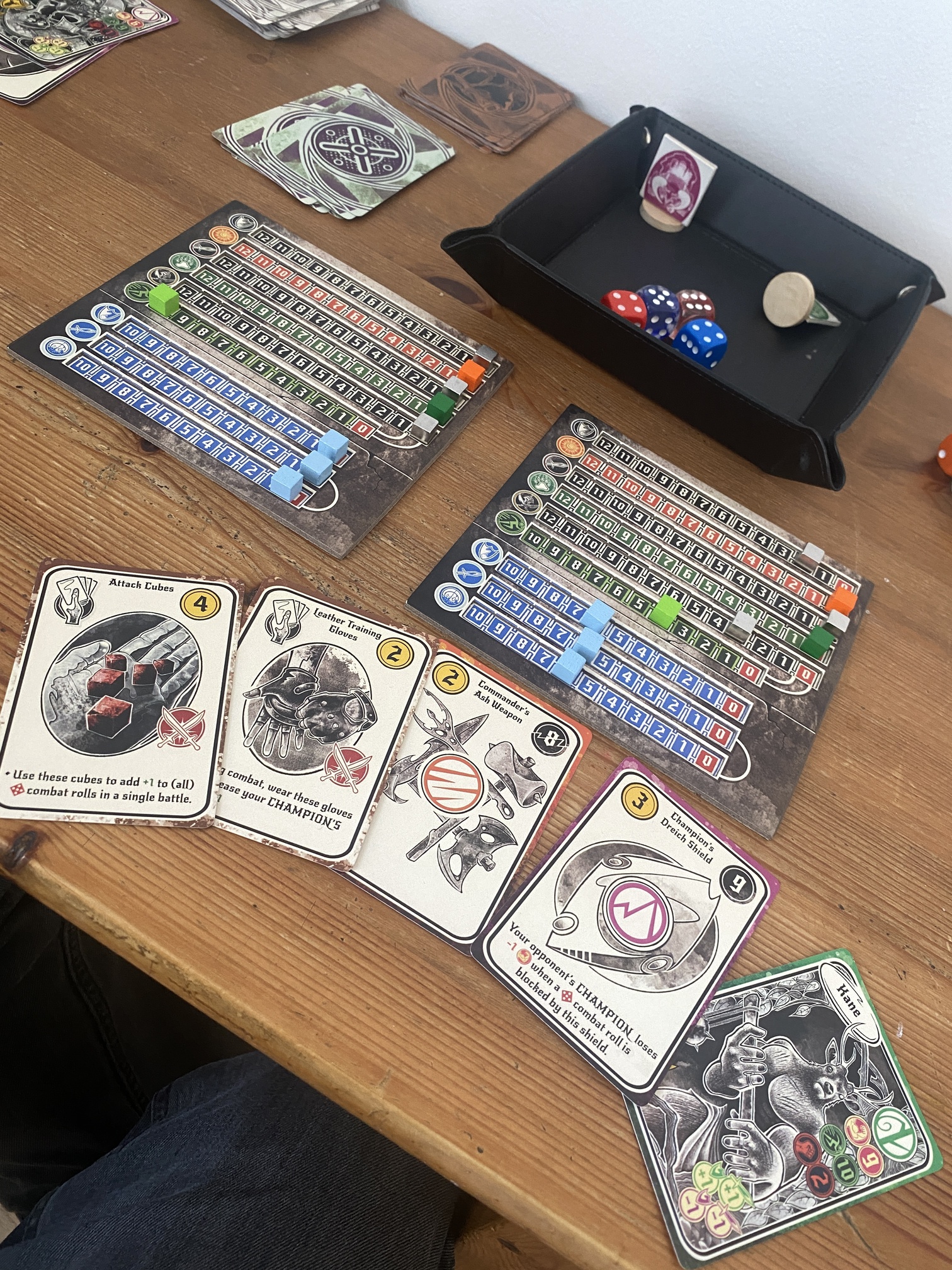I finalised the combat mechanics in Champions! A few tweaks here and there and I’ve got a really fun, sometimes tense battle going on. 5 dice and a lot of fun combinations including some crazy cool mitigations all thrown in a pot of fast paced combat fun!
