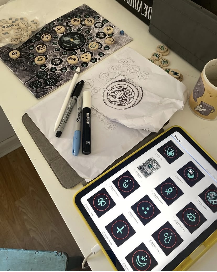 Been working on my occult puzzler, while I’m waiting for some samples. My buddy Sabrina has Playtested it 66 times now. The boards have changed a few times! These pictures are the lastest(rejected) board. It seems it’s way too busy, she was knocking counters everywhere😂,so back to the drawing board. The mechanics are almost down, it’s a real thinker of a game and it’s a lot of fun. It’s pretty hard though, you can’t fluke a win, you really have to think ahead or you’ll die for sure! It’s called Fractured Rift.