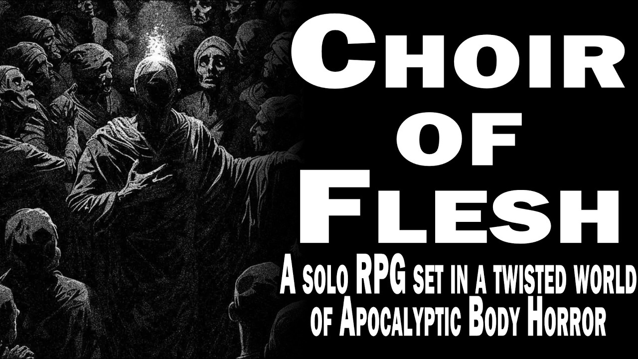 Daniel (@dungeondive) reviews Choir of Flesh from Black Oath Entertainment, positioning it as the ideal “next next step” in solo RPG complexity after Machine Gods. Set in a dark, religious body-horror apocalypse reminiscent of Blasphemous, the game wraps survival mechanics around a settlement-building core. Players manage a home base—gathering exotic food, metals, stone, and water to construct buildings and sustain a population—while venturing into a node-mapped world to find clues that unlock expeditions.