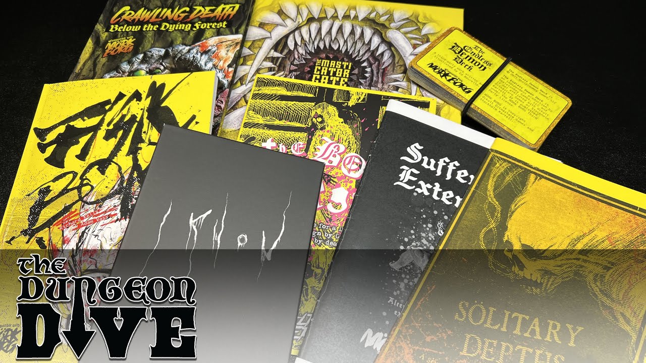 Daniel (@dungeondive) explores seven recent Mork Borg supplements including Icon (official sealed gods), Suffering Extended (expanded character creation), Solitary Depths (solo play enhancement), Bork Morgue zine (fan-created supplement), Crawling Death (dungeon generator), Fish Borg (dedicated fishing system), and the Masticator Gate with Endless Demon Deck (large campaign). He emphasizes that collecting and reading Mork Borg material is as valid a hobby as playing the game, sharing how different supplements expand character creation, solo mechanics, and encounter variety.