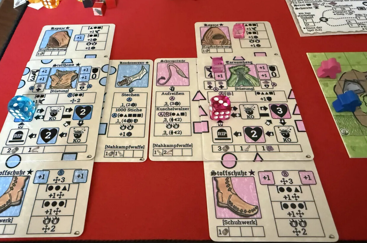 But I am really happy with the result of this boss battler for your pocket. So if you like fighting bosses and also love crafting gear, please check this game out. What makes the game special, besides the boss fights? You have small (half) icons (circle, triangle and square) on the edge of the cards. By combining different equipment, you complete these icons and unlock new abilities, bonusses and attacks. Each new equipment will change your possibilities in this game.