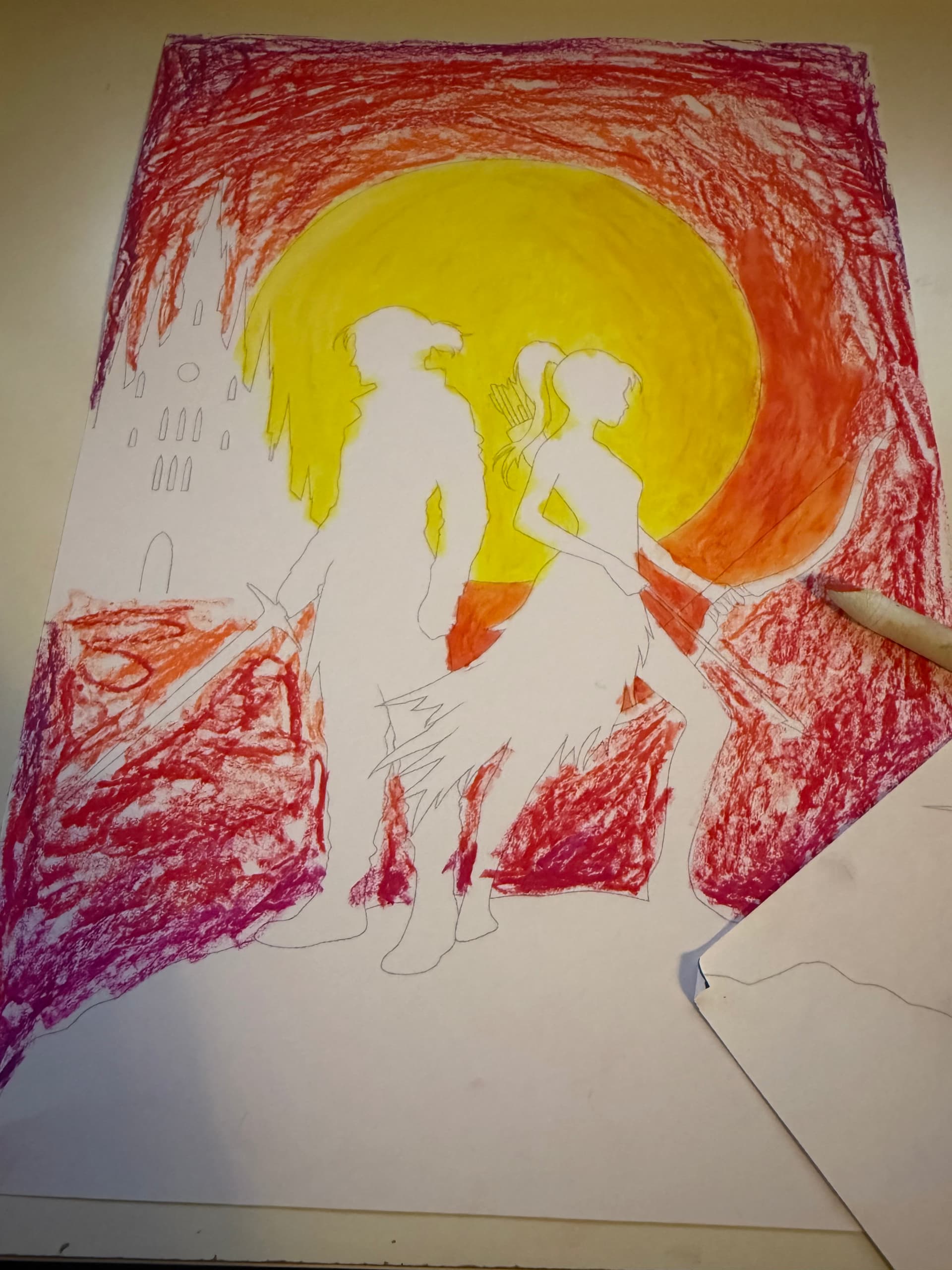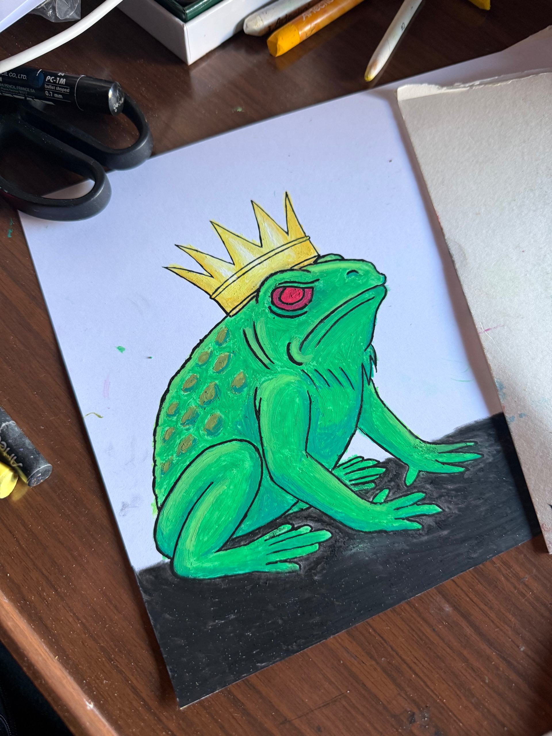 Here’s a preview of the Frog King. Drawing with oil pastel chalk on paper. Will be later scanned and a bit digital corrected.