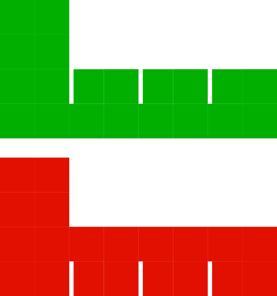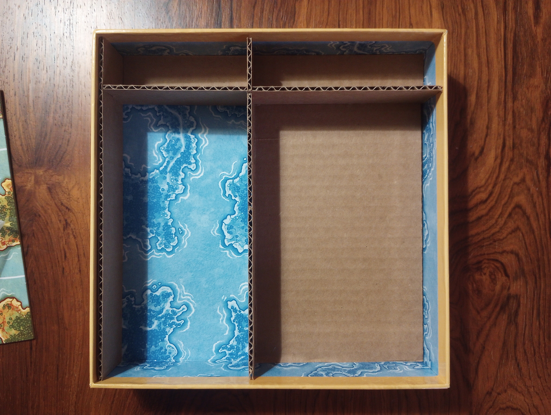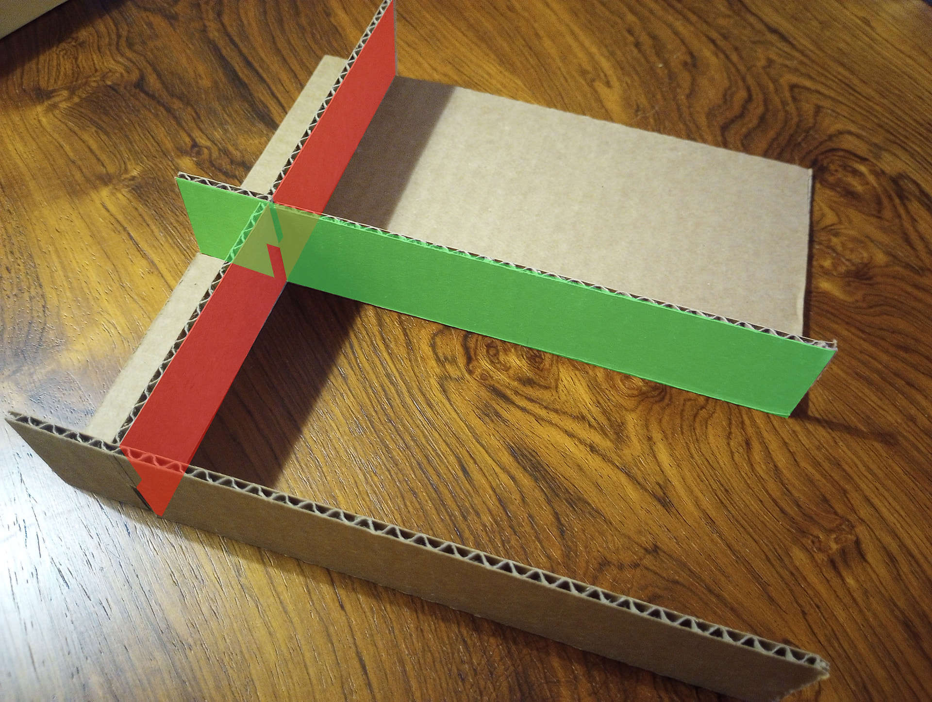 The insert is just some walls that divide the box into different regions. Start by cutting all the walls you need to fit the length, width, and height of your box. In this case I have a total of 3 walls, plus some “floors” under some compartments. I was mainly focused on the compartment in the bottom-left corner that’s holding map tiles. I measured out where the walls should intersect to create a compartment in which 2 piles of tiles fit snugly, and then left the rest of the box for leftovers. I’ve used red and green highlighting here to schematize how to cut small notches in the walls so that they slide together at their intersections. 2 walls in the green pattern + 1 in the red pattern make the core of this insert. Some glue at the joints, plus the floors, adds stability,