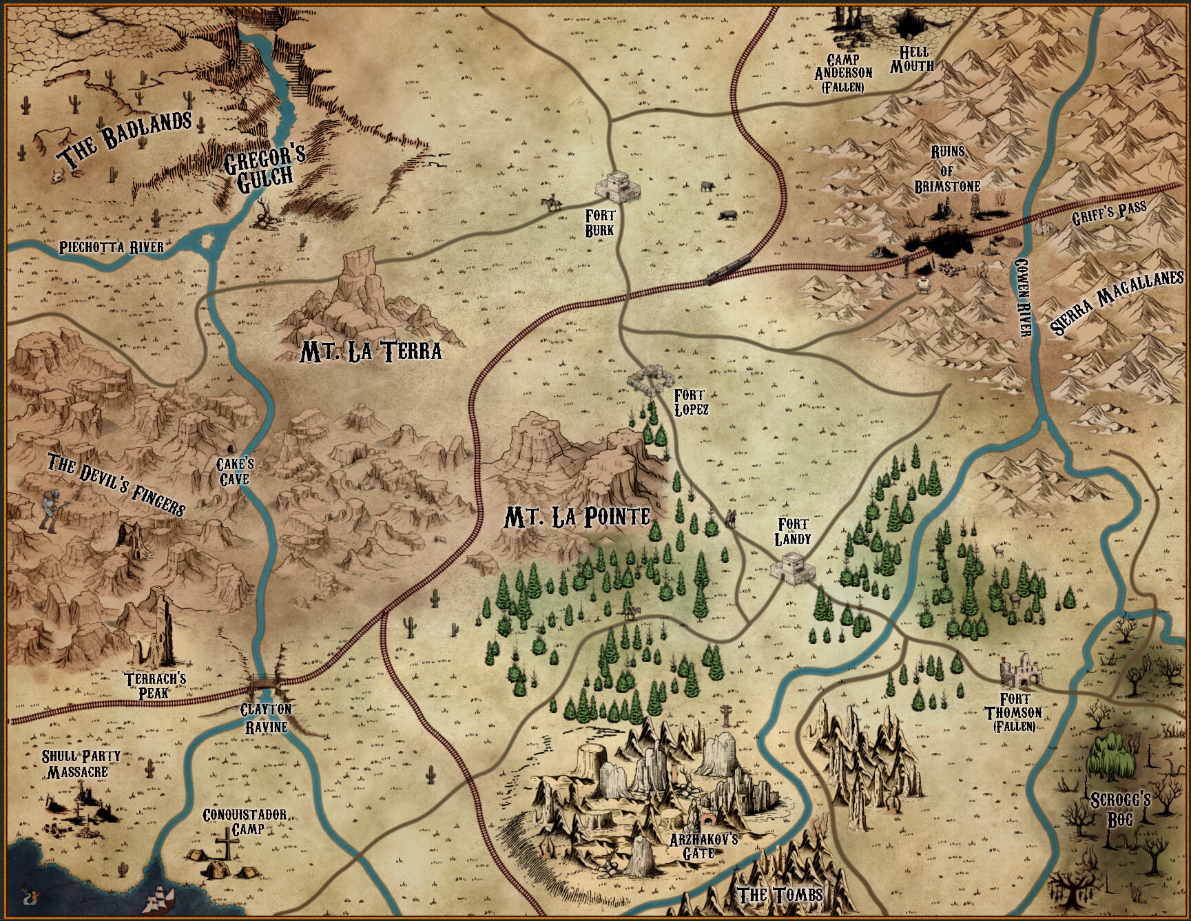 EDIT: Adding the map we’re going to fill in as we create towns in the OP too. Not using any sort of physical travel across it. Just for immersion’s sake (and based on the adventure book map).