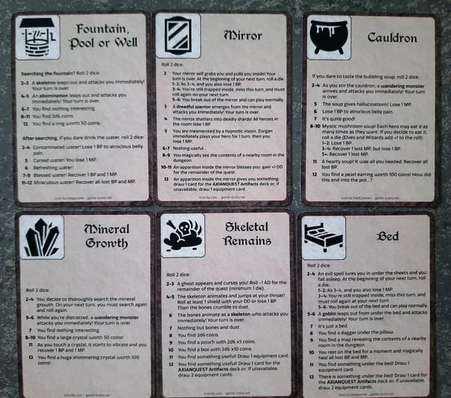 - Based on Axion Quest (pictured) /Dungeon Universalis and many others, feature cards that can appear in each room.
