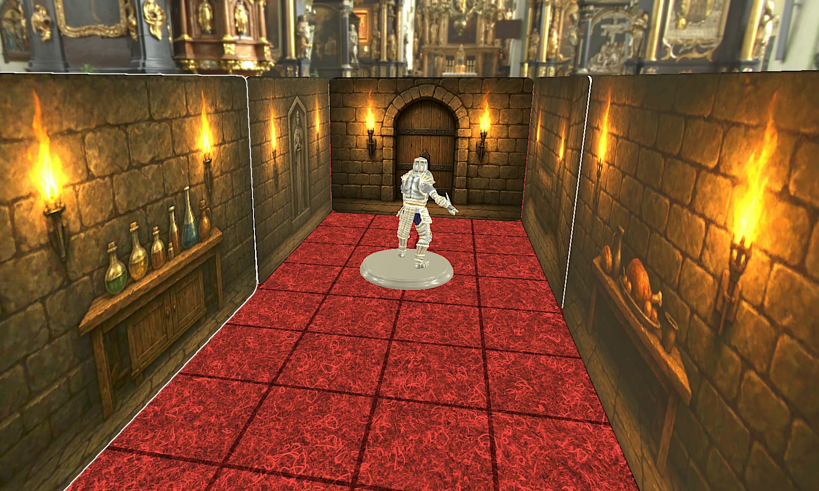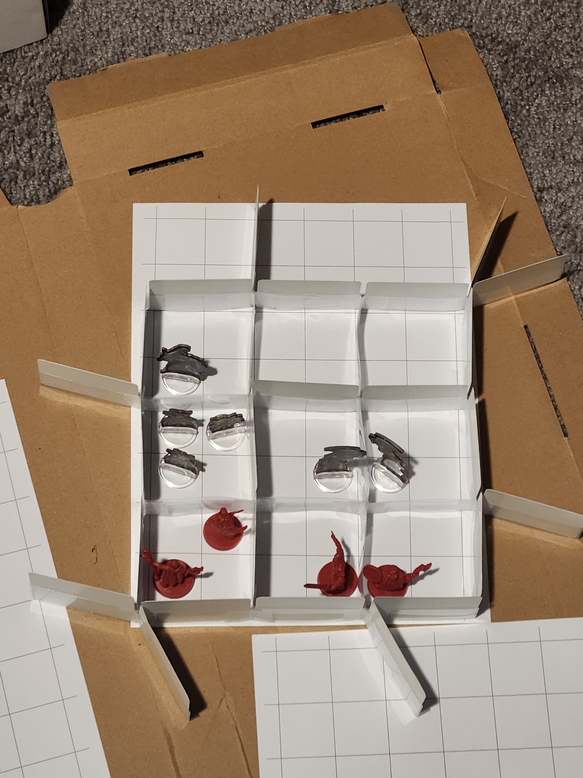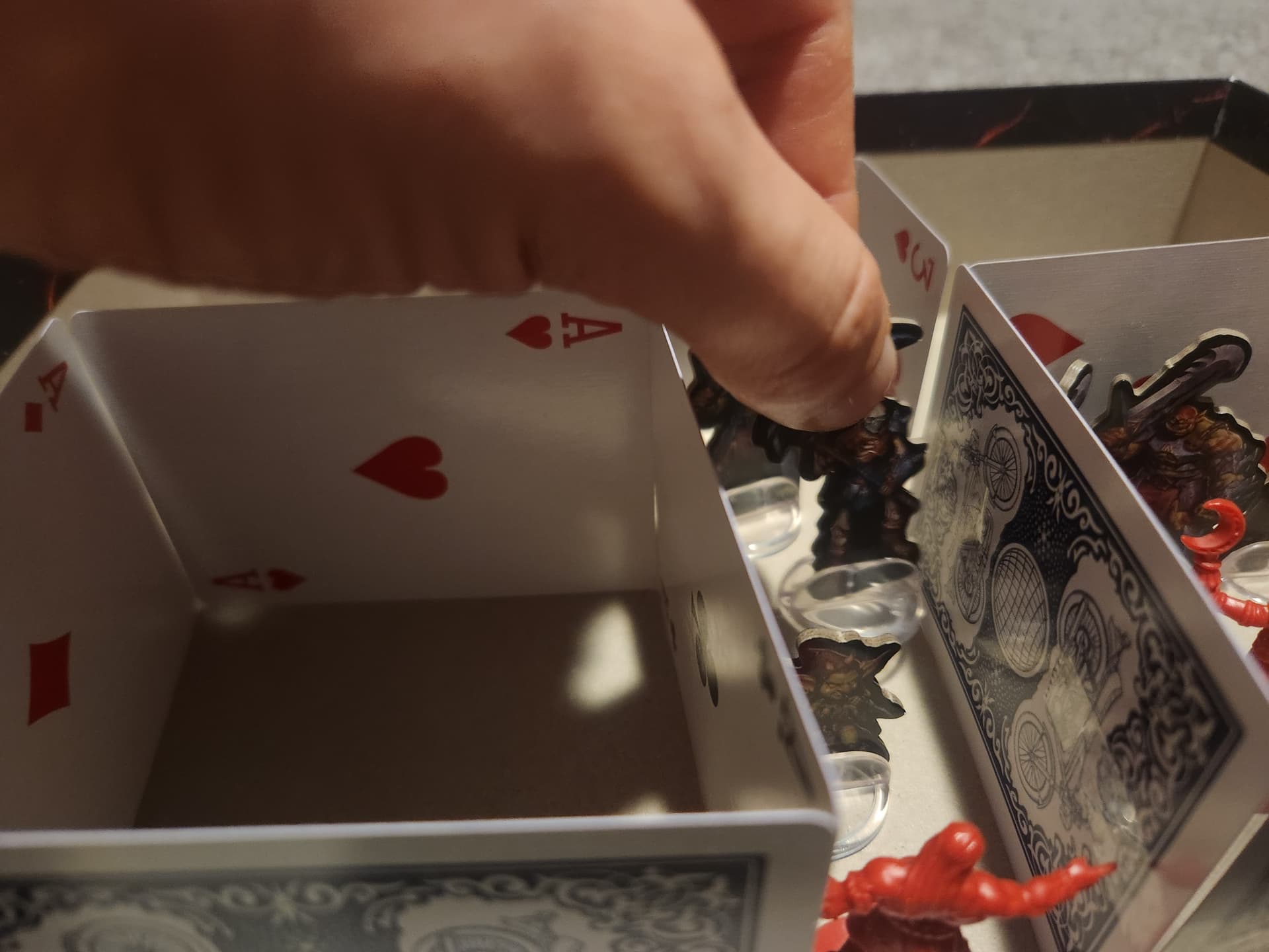 Using this method, you can, in a single 3.5"x3.5" room contain 4 cards worth of information… even 5 if you put 1 on the floor to represent some additional feature (like a magic circle, or a fountain). The “spaces” are slightly larger than AHQ and I’m sure it would be a little bit troublesome to move pieces around if the card’s weren’t secure but…
