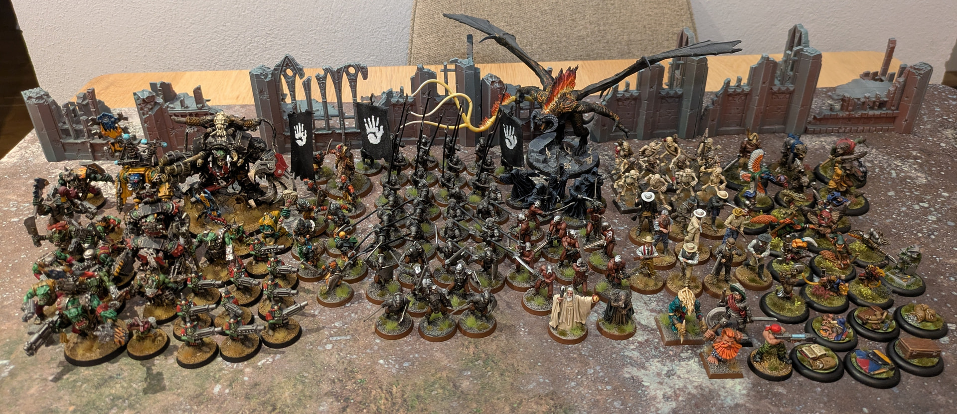 Plus a bit of plastic terrain, which isn’t my usual choice, but the old plastic ruins are a classic and the GW walls and fences are a great priced box for what would take a long time to craft.