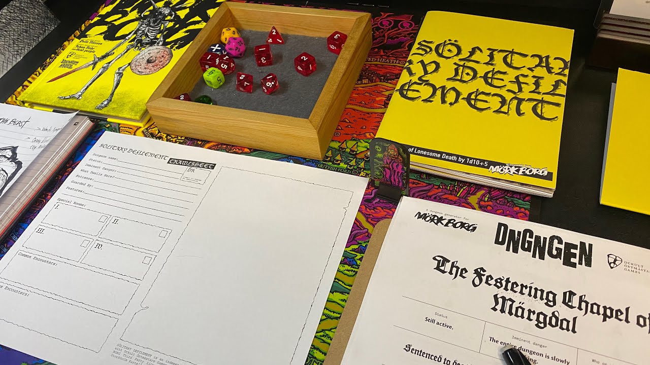 Daniel (@dungeondive) concludes his four-part series with the final dungeon crawl to the Festering Chapel of Morgdal, where Vimet confronts the beast he’s been hunting. This session demonstrates the dungeon crawl mechanics, showing how special rooms funnel players toward the final encounter and how combat resolves quickly in Mörk Borg’s light system. The video emphasizes how the game’s simplicity allows for creative problem-solving beyond violence—Vimet discovers the beast wants sympathy, opening possibilities for non-violent resolution that fit the game’s dark, absurdist tone.