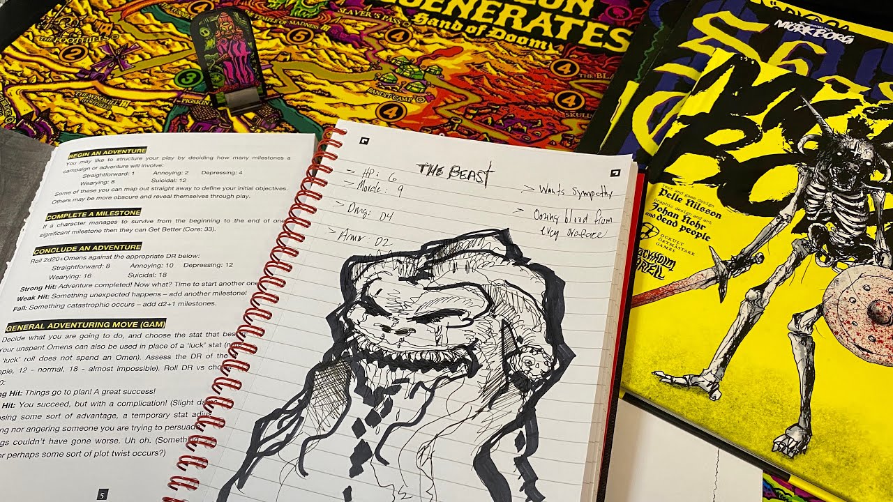 Daniel (@dungeondive) continues the solo campaign with a city crawl through Pigskin Port, the second major gameplay segment. Using the Alone in the Crowd supplement from Solitary Defilement, Vimet navigates urban encounters, avoids cults, and eventually locates a barber surgeon willing to graft his attacker’s tentacle onto his body for payment. The session demonstrates how Mörk Borg’s oracle-driven system generates urban adventure through random street descriptions, NPCs, and businesses, creating an unpredictable yet narrative-rich experience within a structured framework.