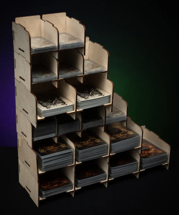 I love the wooden modular card holders from Laserox. Not sure if they ship to the US, though (Switzerland here (-: ). They are stackable, come in different sizes and connect horizontally through magnets. You can build whatever card holder tower you require.