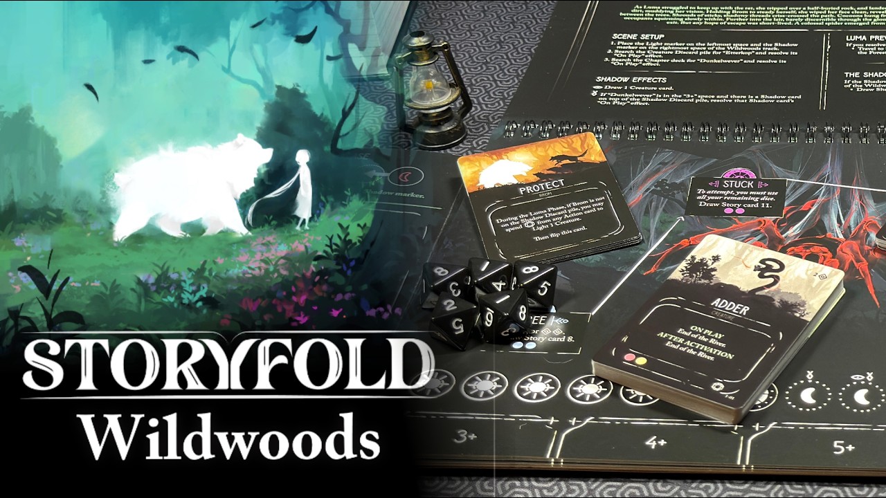 Daniel (@dungeondive) unfolds Storyfold: Wildwoods—a solo narrative card game that plays like a tabletop Spirit Farer or Child of Light. You guide Luma, a young girl bound to the light, and her bear companion Braum through a corrupted forest across five chapters of branching story. The twist? You’re not fighting—you’re healing. Creatures are cleansed rather than killed, light is cast rather than swords swung, and the tug-of-war between illumination and shadow drives every decision.