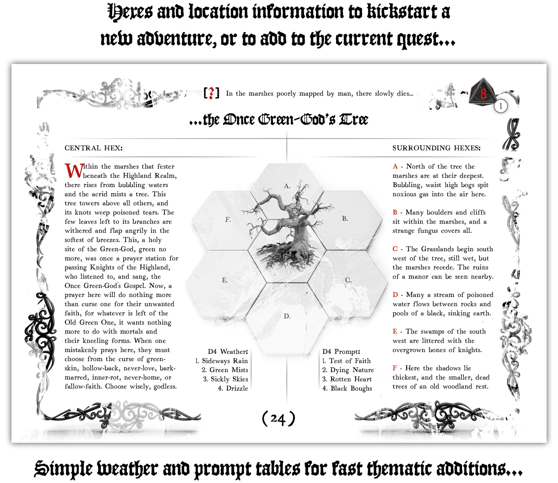 … I have never created for Shieldice Studio in such a way, and I hope, within the words, you can find my passion for Absalom’s quest, and the many oddities my mind conjured throughout it. I have attempted to document the items and locations so that they might be used within any system, and in any fantasy journey. I hope, whoever you might be, that when setting out solo, or planning for a party, you can find new and wonderful ways to expand upon this scattered Kingdom of an Ancient Dawn. Who knows, you may even come across the cairn which covers the bones of Absalom himself.’