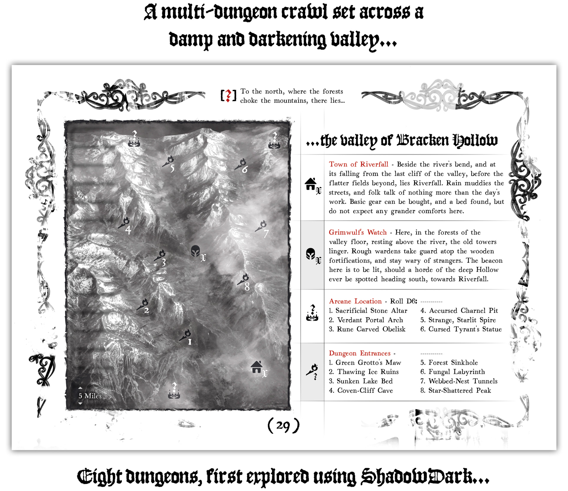 It will be released to backers as early as March, on campaign completion! I’ll pop some notes below on how this came to be. I had so much fun creating this digital book from solo playthrough notes, using Shadowdark!