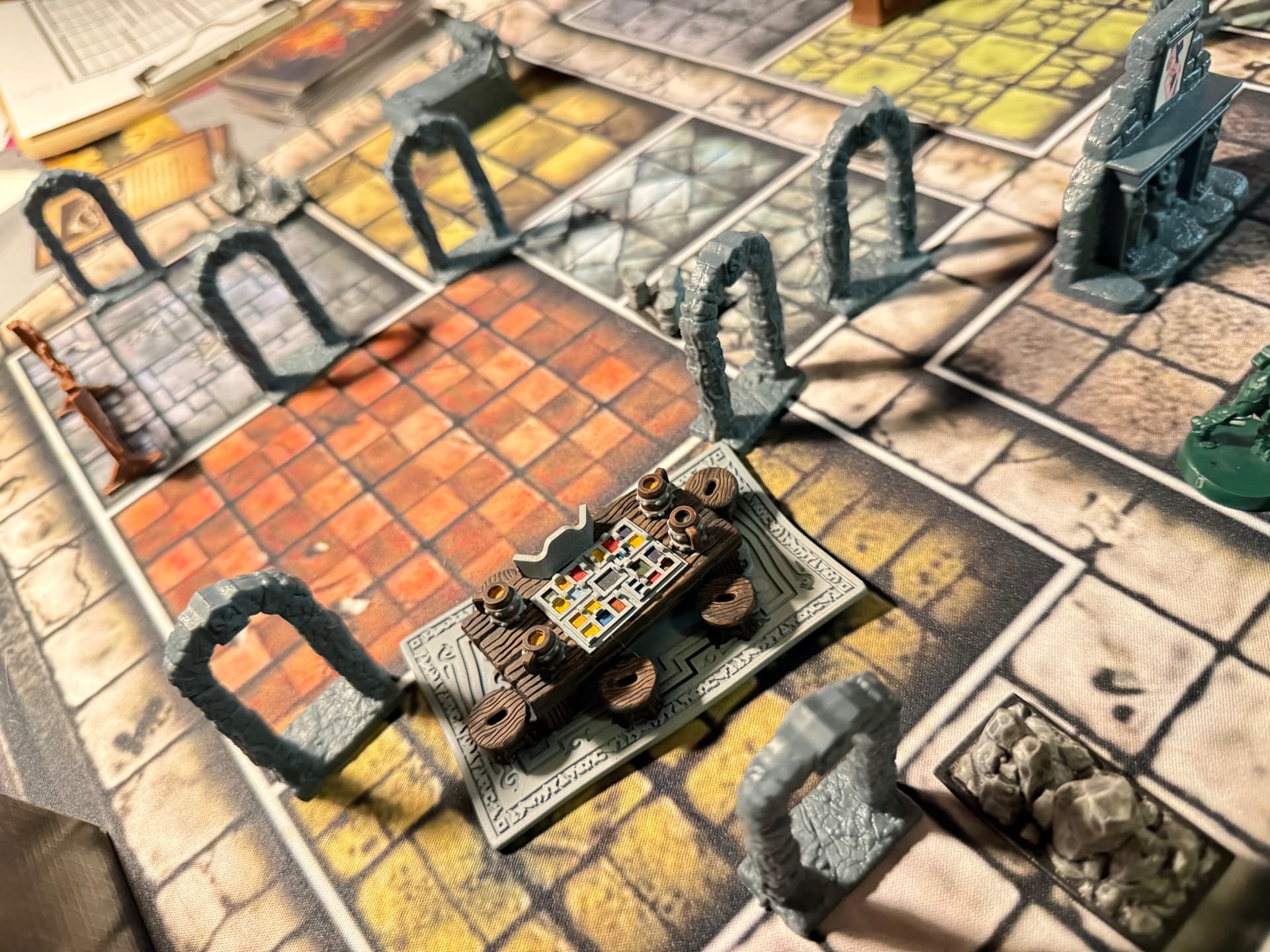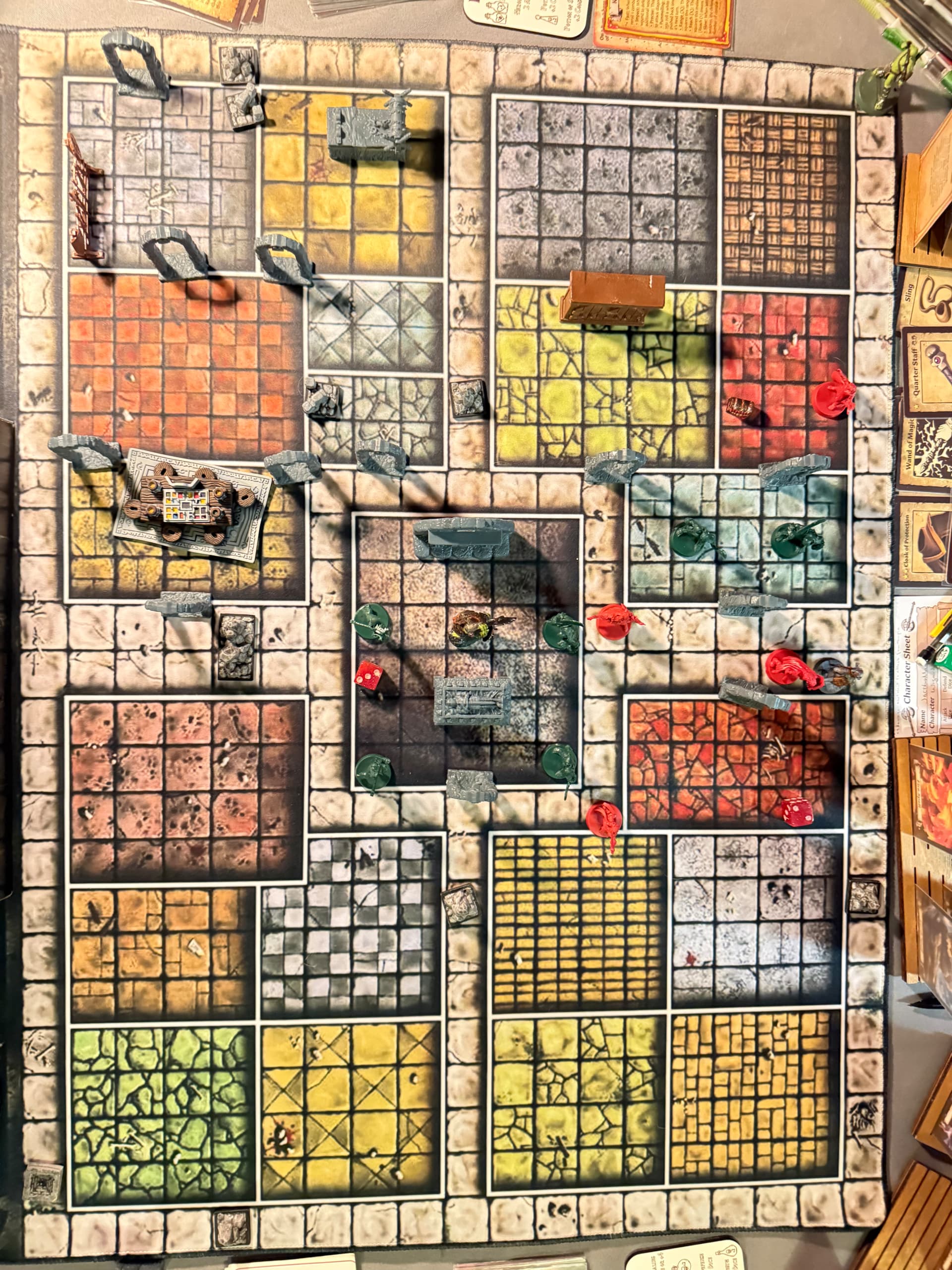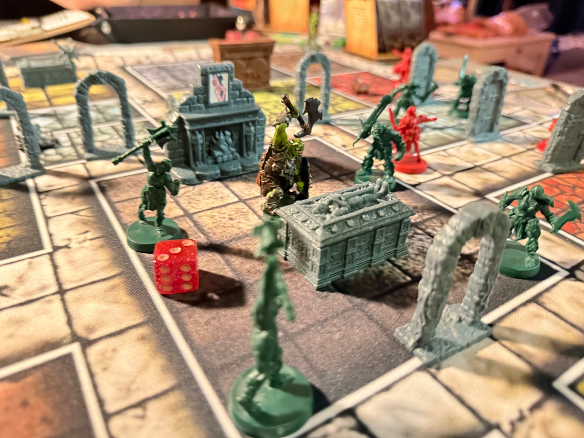 Heroquest Quest Report ‘SundayQuest Vol 8’: “Crypt of the Orc Warlord”. Ulag Shozbog lives! With the previously obtained map of the Crypt the heroes start of with an advantage knowing the layout of rooms and the likely location of the Orc Warlord’s burial mound. Nez (Dwarf), Ser Lichen (Knight), Jacobus (Wizard), Lynx (Elf) and Ithil Anar (Elf) head straight for the center room to find Ulag resurrected once again! An epic battle is engaged with Ulag unleashing powerful new magic in the form of Lightning Bolt and Summon Undead. Just when they believe they have defeated him and begin to head to the exit, he rises again! The heroes fight through the undead hordes surrounding Ulag and once again slay their necromantic foe. Ulag’s body falls to the floor. Dead. His lifeless corpse begins to glow and then it disappears; the heroes suspect some foul Dread sorcery is afoot.