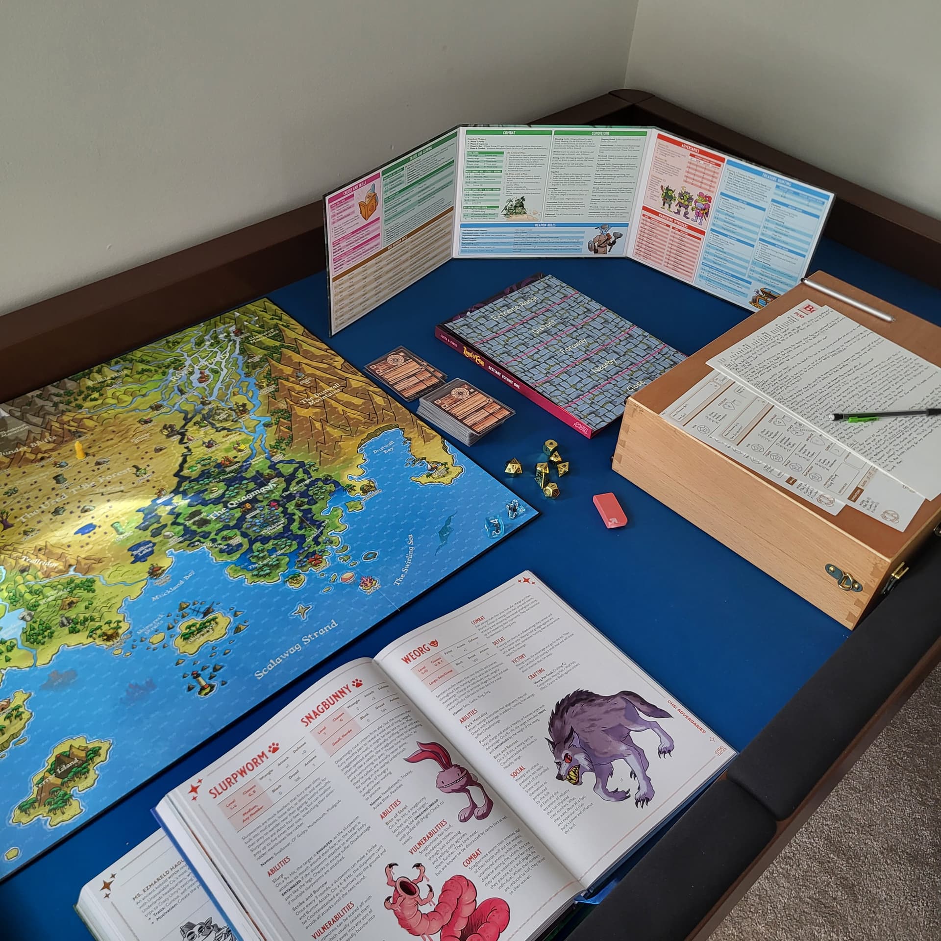 I will say The Mucklands Sandbox Campaign Setting book is a must have along with the core rulebook. This book provides everything you need (the book is 425 pages) for each location and 4-5 quests per location. It allows you to have plenty to do while not having to make-up quests (you can still create your own quests of course). I personally went all in, since it gives you the map board and an additional bestiary book. If you hang out on their webstore for a second, a 10% off offer will appear. You can also download their QuickStart guide for free which gives you an example quest and how things are laid out.